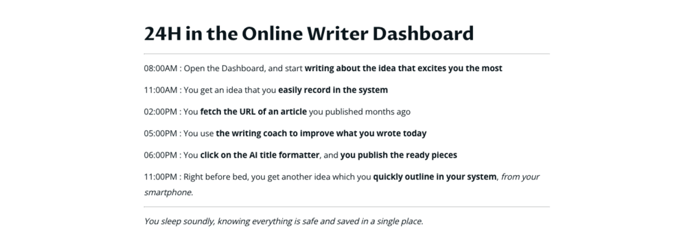 The Online Writer Dashboard will organise all your writing for you : from ideation to publication. And it comes with plenty of useful tools to improve your writing, directly integrated into your workspace.
